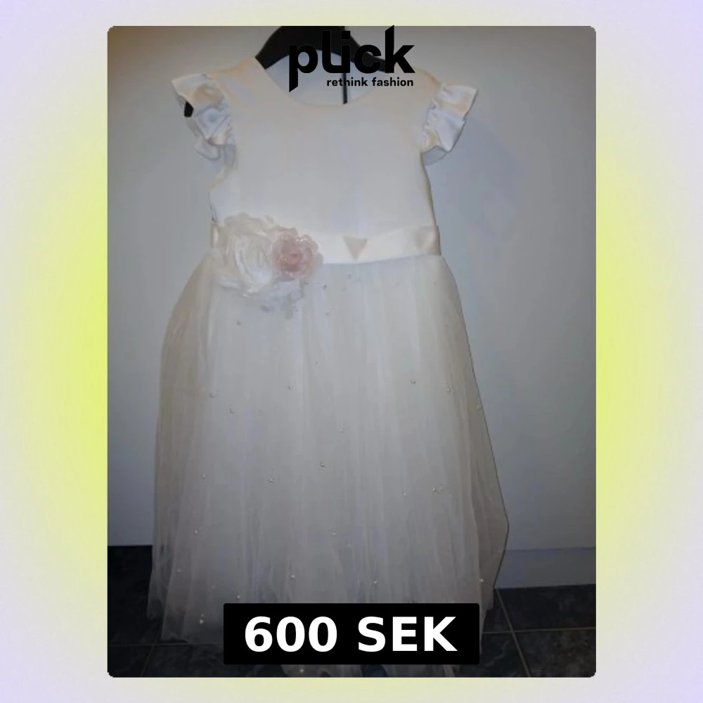 Superfin vit långklänning med fluffiga korta ärmar och ett skirt tylllager dekorerat med små pärlor. Midjan pryds av två stora tygblommor i vitt och ljusrosa. Klänningen har en elegant och romantisk look, perfekt för speciella tillfällen.