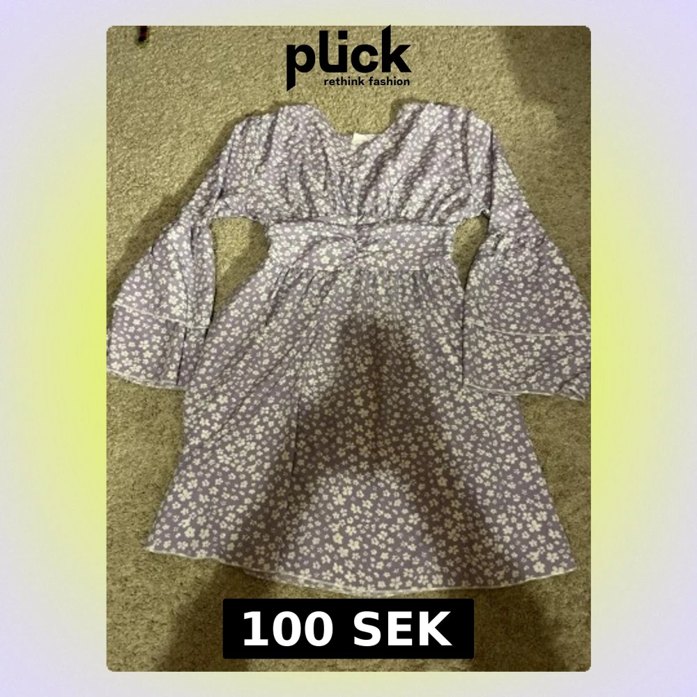Supersöt ljuslila klänning med vita blommor och v-ringning. Klänningen har långa, vida ärmar och markerad midja som ger en fin siluett. Perfekt för vår och sommar! Materialet känns lätt och luftigt.