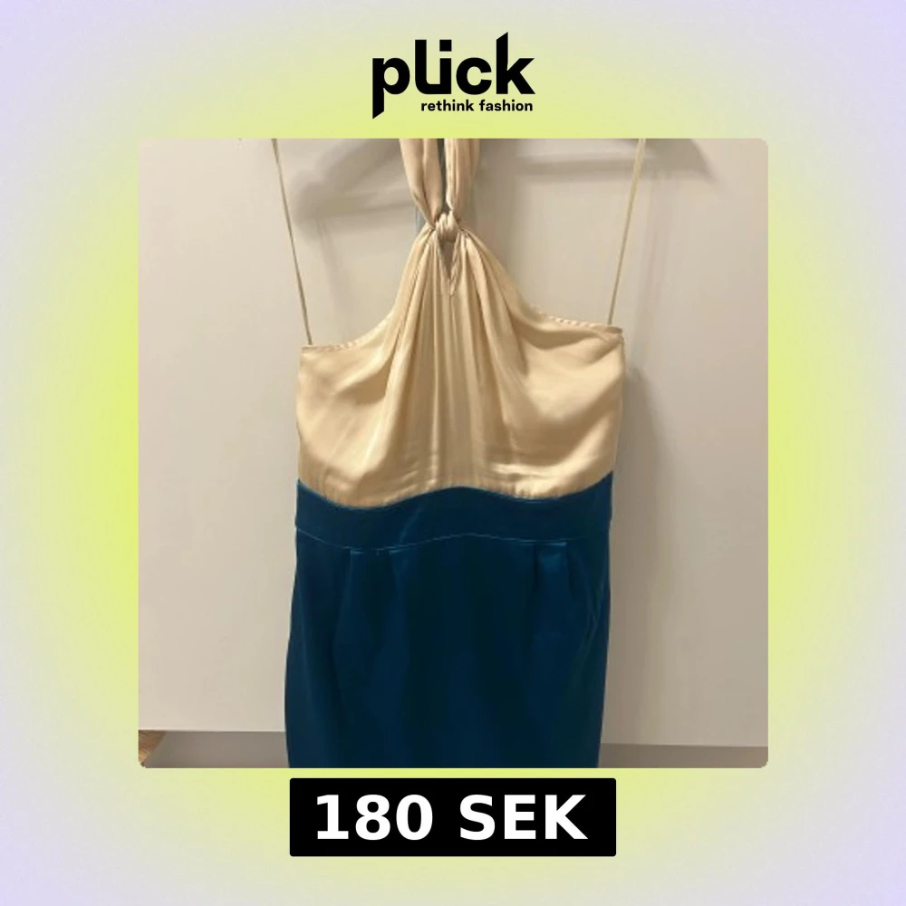 Supersnygg halterneckklänning från Belle by Oasis i glansigt material. Överdelen är champagnefärgad och underdelen är blå, med en elegant knut i nacken och smala axelband. Klänningen har dragkedja i sidan och en figurnära passform som ger en chic siluett.
