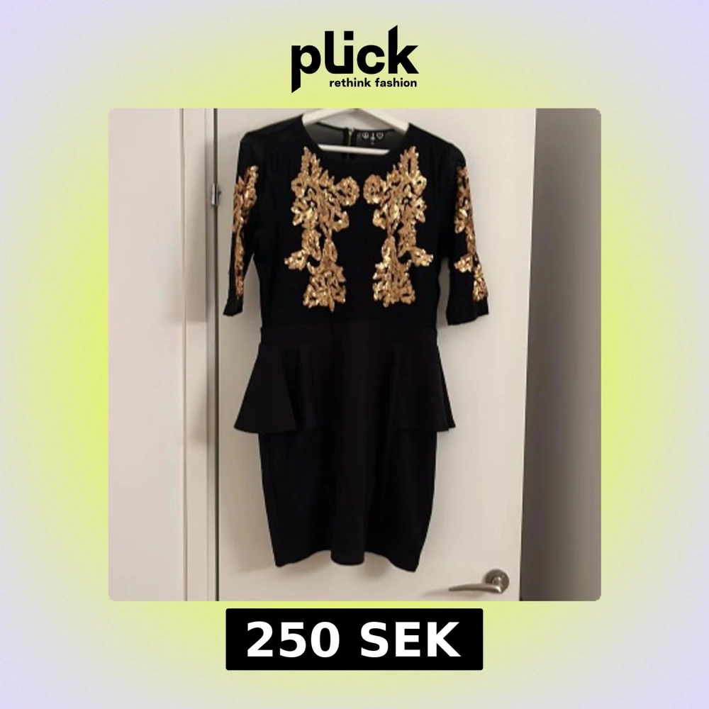 Snygg svart kort klänning med guldiga paljettdetaljer framtill och på ärmarna. Klänningen har peplumvolanger vid midjan, halvärmar och en synlig dragkedja baktill. Perfekt för dig som vill sticka ut med glittriga detaljer och elegant siluett.