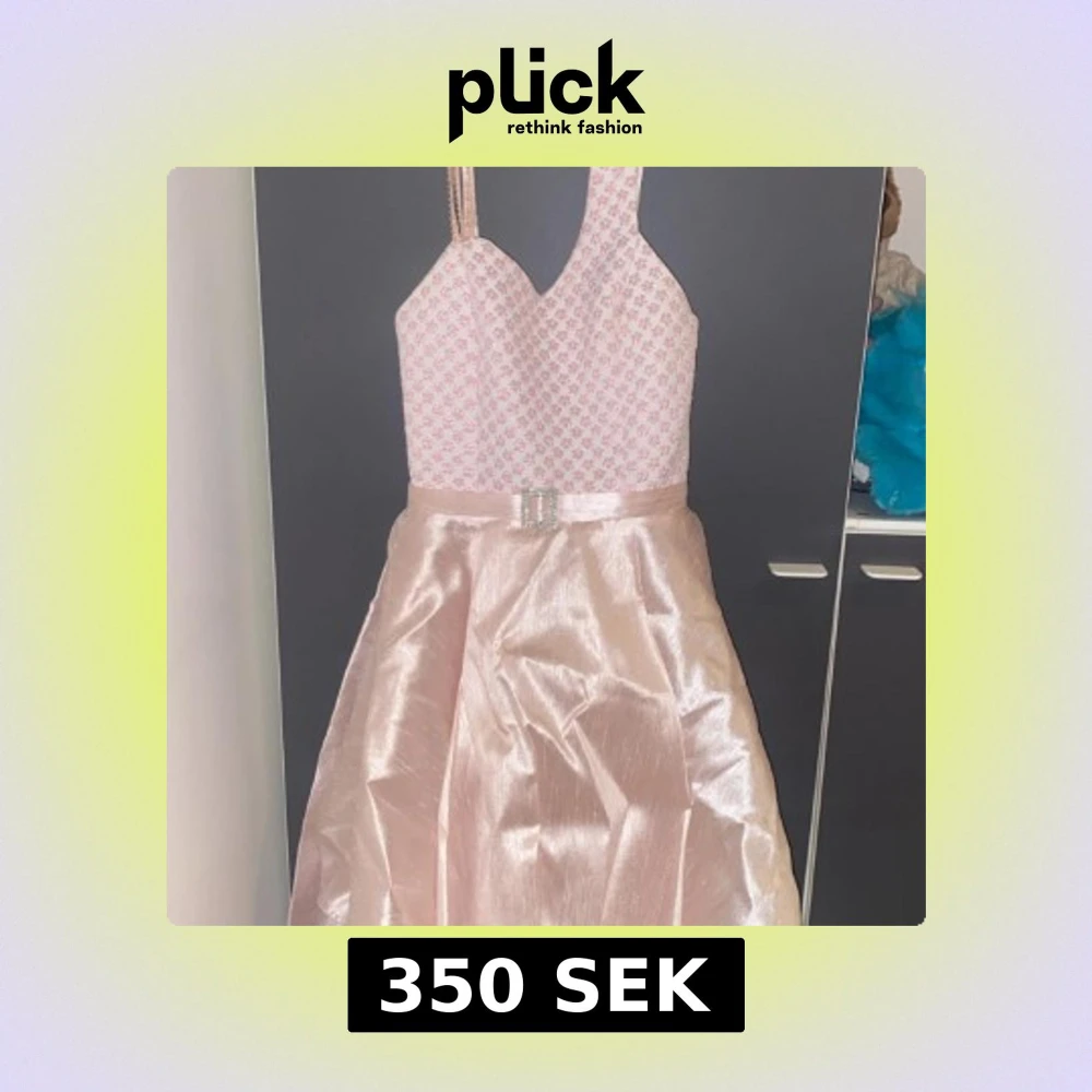 Säljer en elegant rosa klänning från Erkut med ett glittrigt mönster på överdelen och en vacker satinliknande kjol. Klänningen har smala axelband och en dekorativ bältedetalj i midjan. Perfekt för speciella tillfällen! 🌸