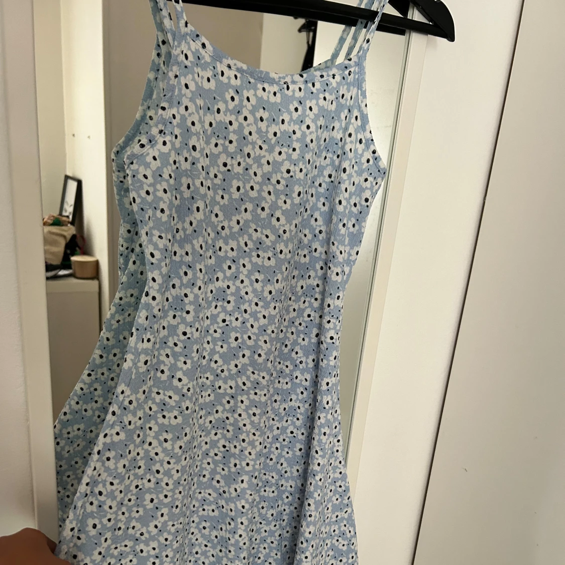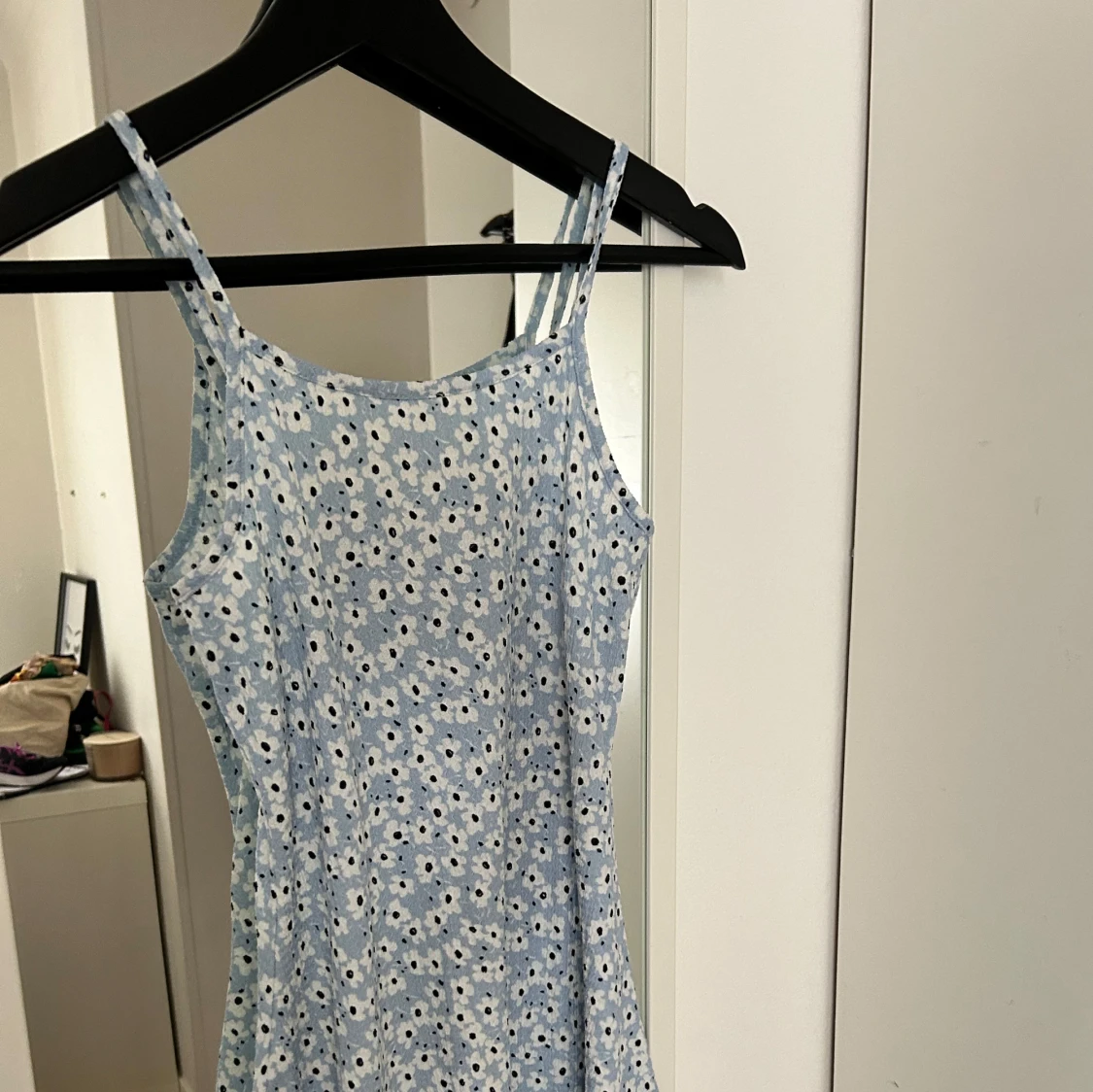 Supersöt ljusblå kortklänning från 157. Klänningen har vita och svarta blommor över hela tyget. Klänningen har smala axelband och en lätt, flowy passform som ger en chill vibe. Perfekt för varma dagar och enkel att styla med sneakers eller sandaler.