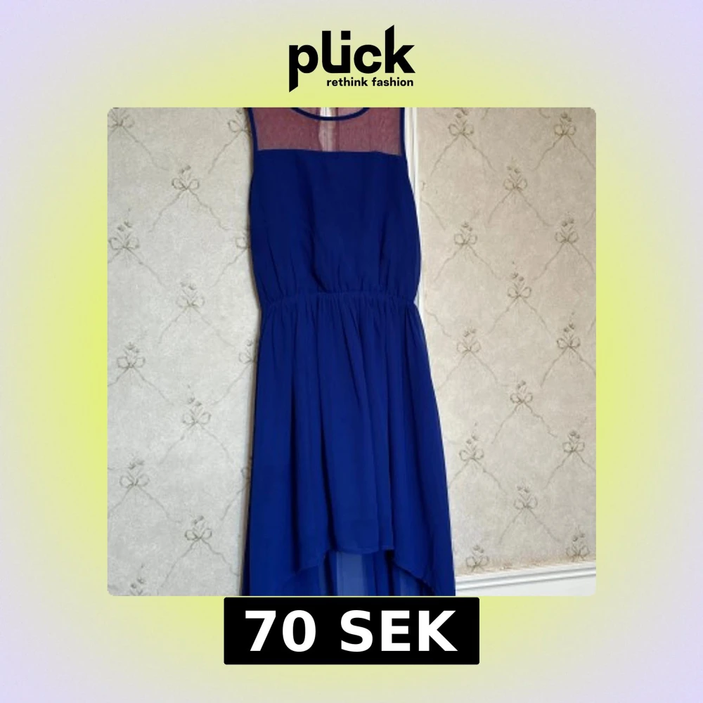Säljer en elegant blå klänning med en prickig mesh-detalj upptill. Klänningen har en luftig passform och en asymmetrisk nederdel som ger en fin rörelse. Perfekt för speciella tillfällen! STORLEK=146cl