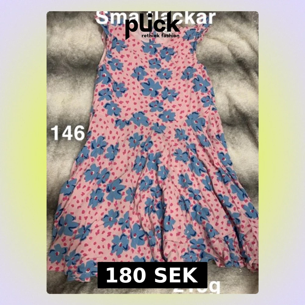 Söt rosa klänning med stora blå blommor och små rosa hjärtan som mönster. Klänningen har kort ärm och en lätt utställd kjol. Perfekt för dig som gillar färgglada och lekfulla plagg.🌸 Har mindre fläckar. Storlek 146
