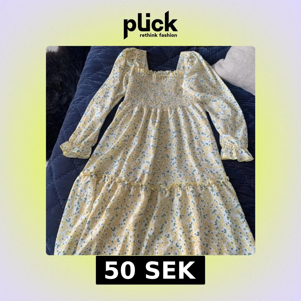 Säljer en söt blommig klänning från Shein i ljusgult och grönt. Klänningen har långa ärmar och en smockad överdel som ger en fin passform. Perfekt för vår och sommar med sitt blommiga mönster och volangdetaljer.