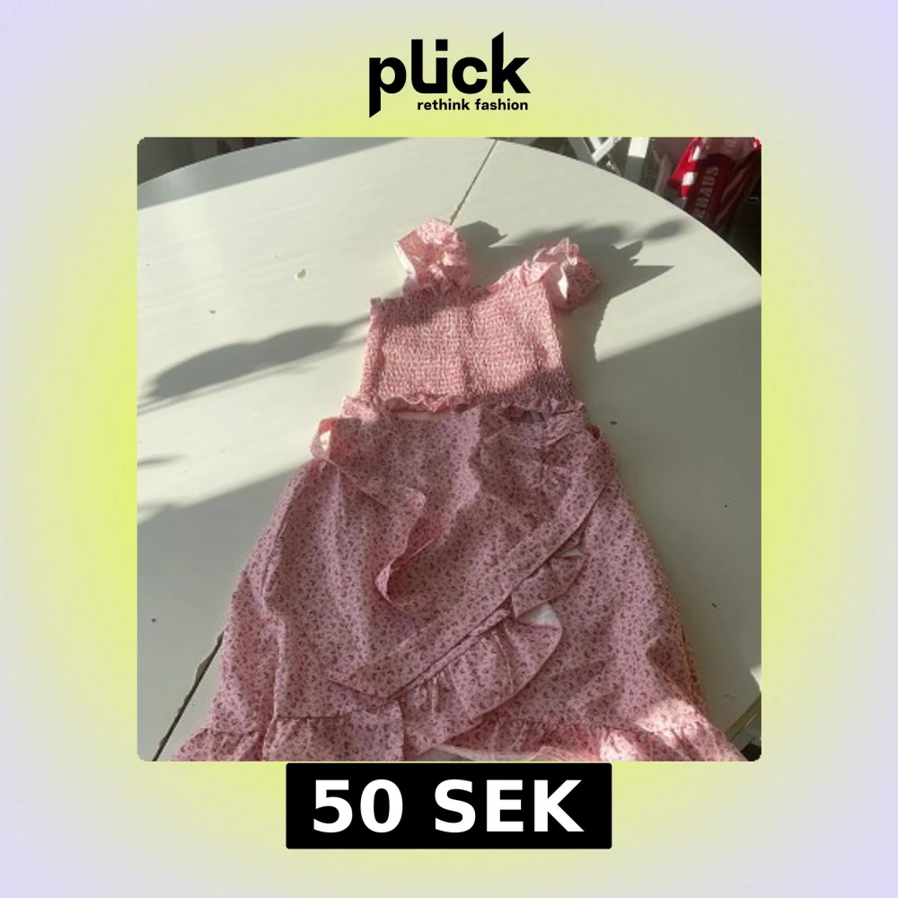 Supersöt rosa klänning med småblommigt mönster och volangdetaljer. Smockad överdel med axelband och omlottkjol med volanger. Perfekt för sommarens alla tillfällen!
