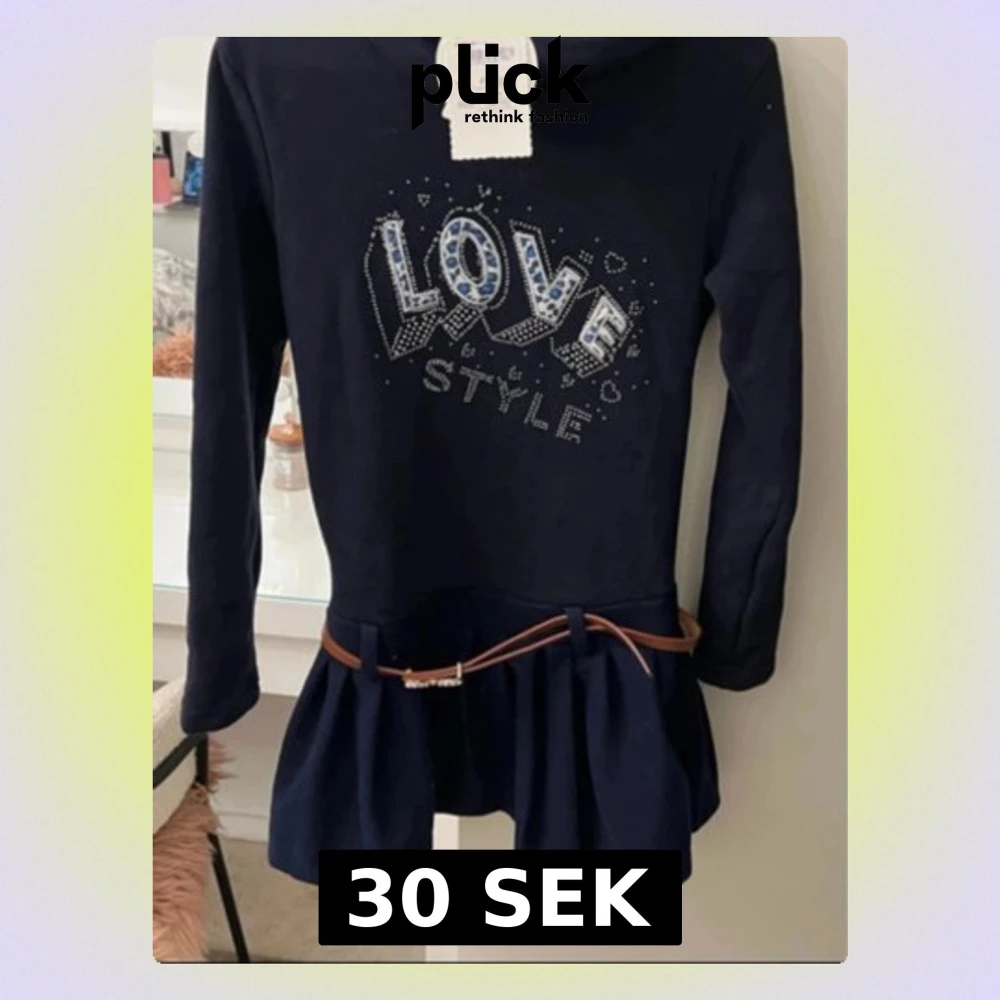 Mörkblå klänning med lång ärm och texten 'LOVE STYLE' i glittriga stenar på bröstet. Kjoldelen har volang och midjan pryds av ett smalt brunt bälte. Perfekt för dig som gillar en trendig och ungdomlig look.