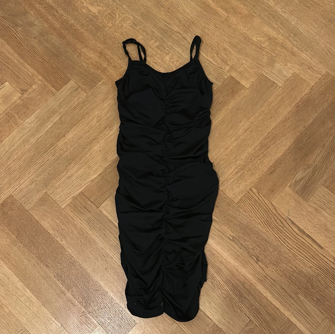 Svart figurnära klänning med smala axelband och snygga rynkdetaljer längs hela framsidan. Klänningen har en kroppsnära passform och är perfekt för dig som gillar en stilren och trendig look.