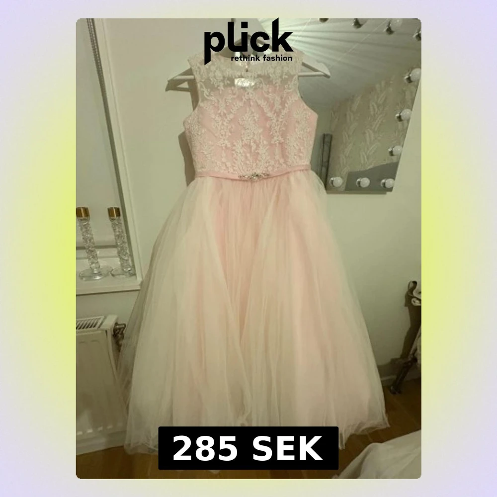 Superfin flickklänning ljusrosa långklänning med broderad spets upptill och fluffig tyllkjol. Klänningen har ärmlös design, knappar i ryggen och ett bälte med glittriga detaljer i midjan. Perfekt för speciella tillfällen och ger en riktigt drömmig känsla.