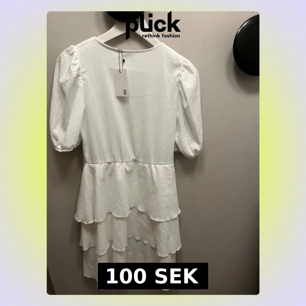 Supersöt vit klänning med flera volanger och puffärmar. Klänningen har rund halsringning och är tillverkad i ett lätt, strukturerat tyg som ger en lyxig känsla. Perfekt för dig som gillar romantiska och trendiga detaljer.