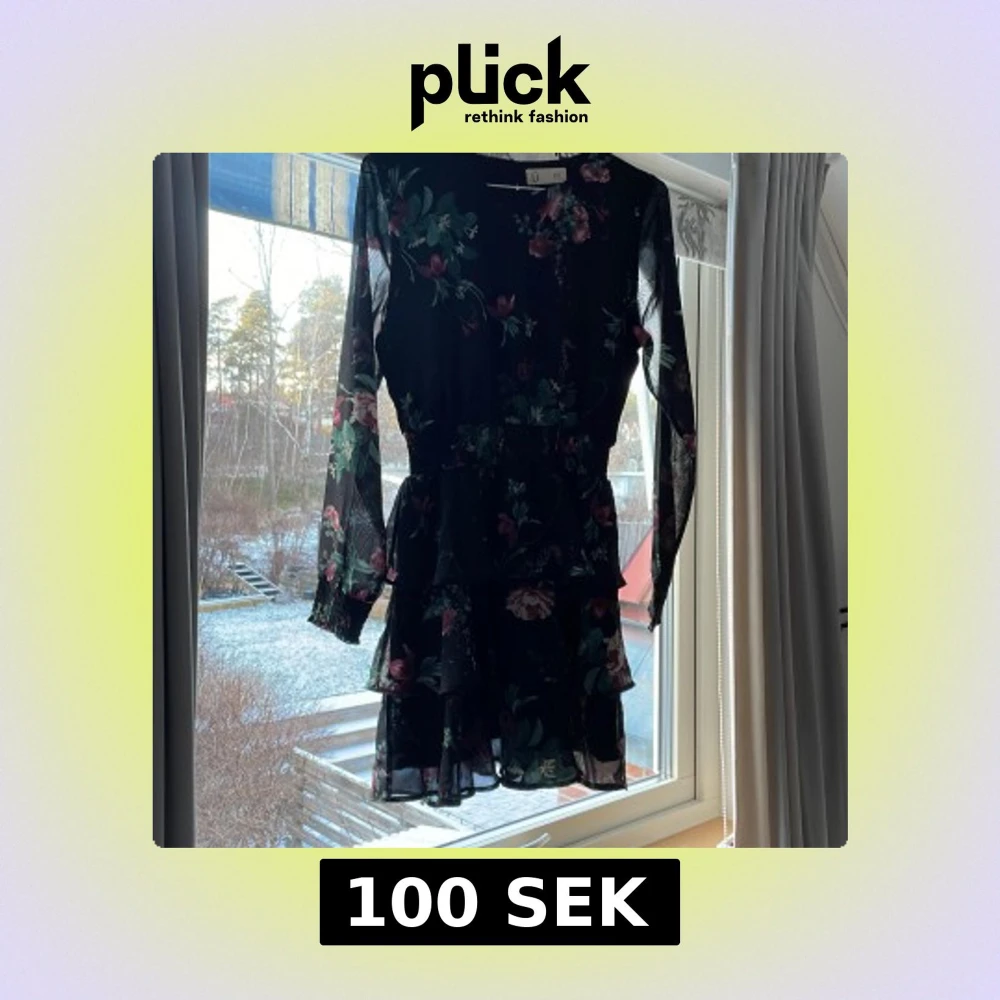 Säljer en svart klänning med blommigt mönster från Ü. Klänningen har långa ärmar och en volangdetalj vid kjolen.inga tecken på användning🩷