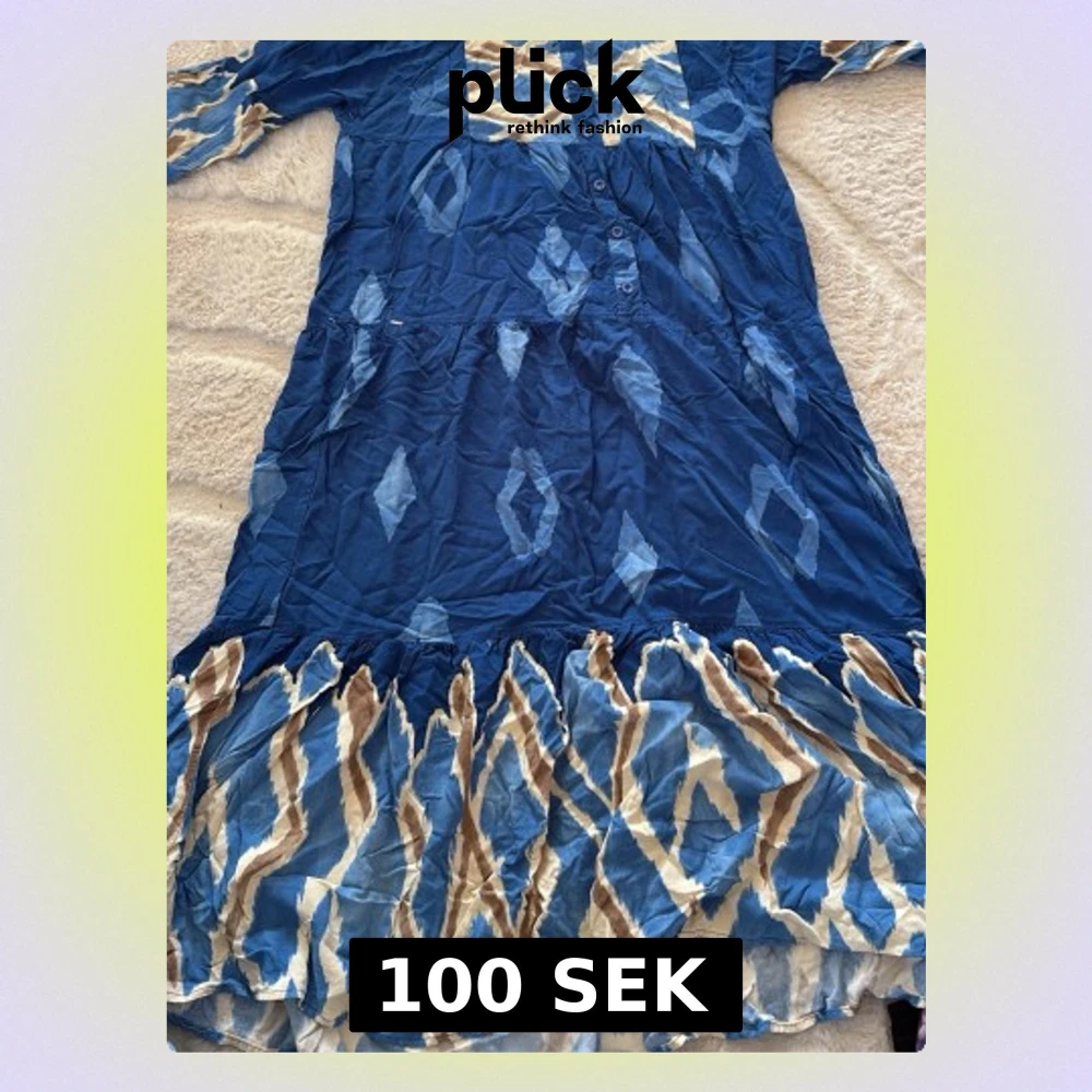 Säljer en långklänning från MMR i blått med beige och vita detaljer. Klänningen har ett unikt mönster, knappar framtill och långa ärmar. Perfekt för dig som gillar bohemisk stil och vill sticka ut med färg och form.