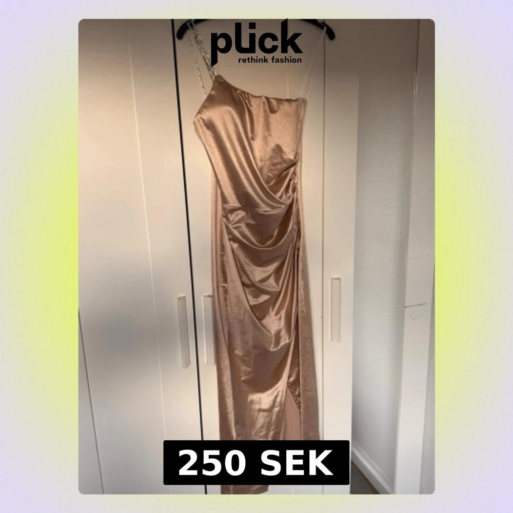 Snygg långklänning i champagnefärg med glansigt material och en axelbandslös design. Klänningen har en hög slits framtill och draperad effekt längs sidan. Perfekt för dig som vill sticka ut med en elegant look.