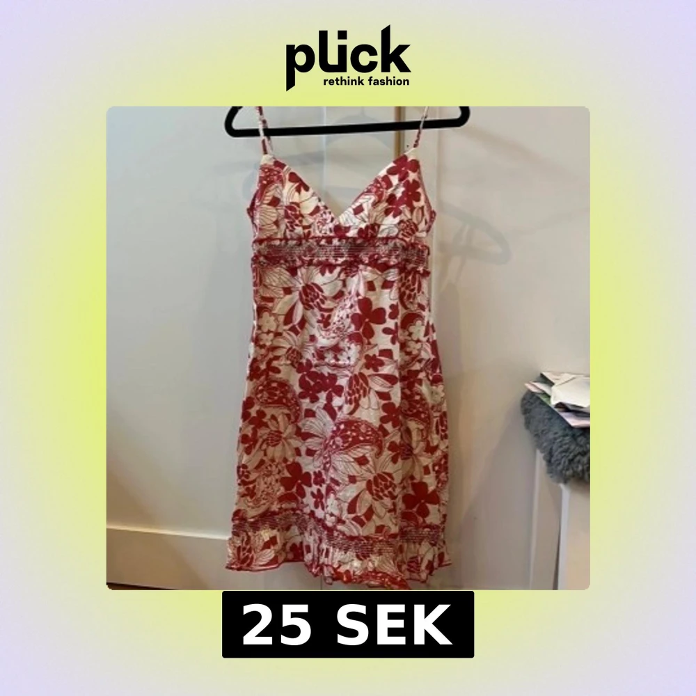 Supersöt röd och vit blommig kortklänning i 100% bomull med smala axelband och v-ringning. Klänningen har smockad midja och volangkant nertill, perfekt för varma dagar. Lätt och luftig känsla, lining i bomull. Snygg till sneakers eller sandaler!