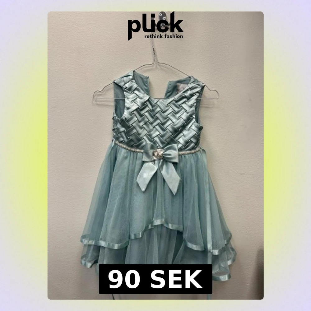 Superfin ljusblå kortklänning med flätad satin upptill och lager av tunn tyll i kjolen. Klänningen har pärldetaljer i midjan och en stor rosett framtill med en liten blomma. Ärmlös modell med dragkedja i ryggen och glansiga kantband på kjolen.