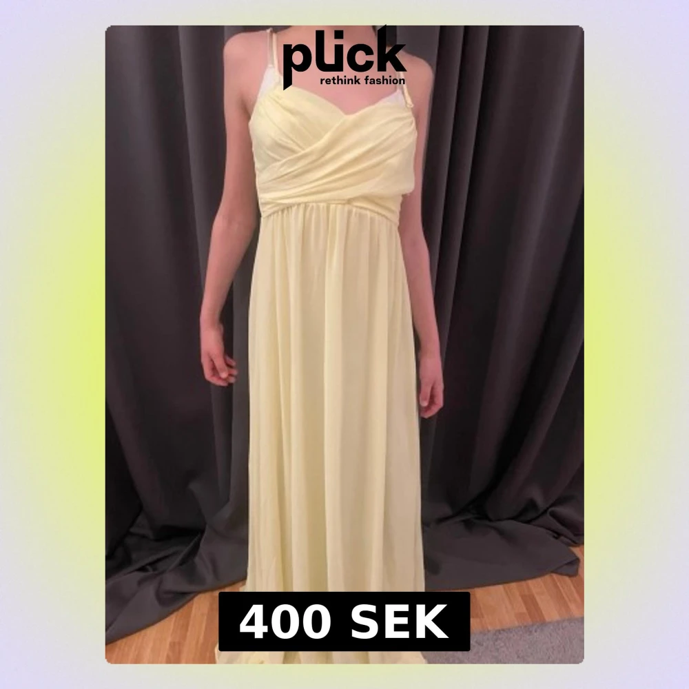 Elegant ljusgul långklänning med smala axelband och omlottdetalj över bysten. Klänningen har ett luftigt fall och markerad midja, perfekt för sommarens tillställningar. Tillverkad i ett lätt och skönt polyestertyg. Man kan även ta av banden. .