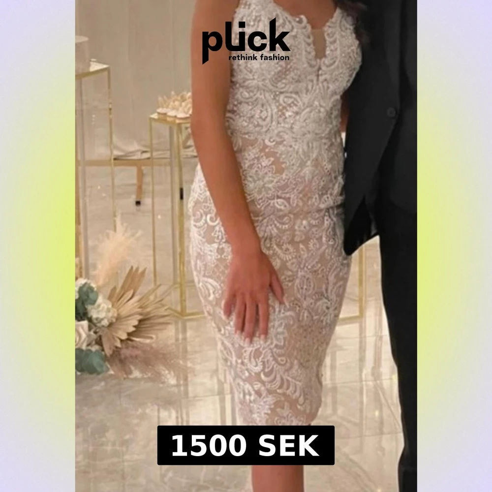 Supersnygg vit kortklänning med tunna axelband och v-ringad urringning. Klänningen har ett detaljerat blommigt spetsmönster som ger extra lyxig känsla. Figurnära passform och öppen rygg gör den riktigt elegant. Perfekt för dig som vill sticka ut. Klänningen är storlek 32/34