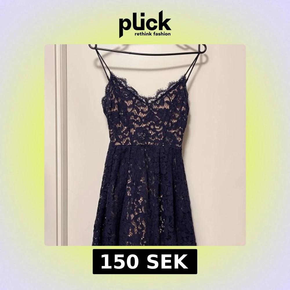 Säljer en marinblå klänning med smala axelband och vacker spets över hela klänningen. Den har en lätt utställd kjol och blommigt spetsmönster, samt nude-färgat foder under. Perfekt för dig som vill ha en elegant look med lite edge.