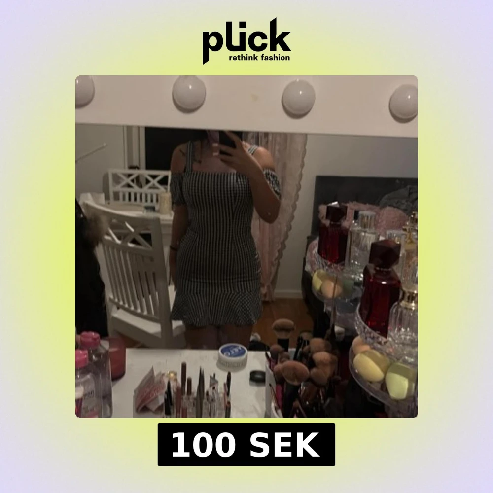 Säljer en söt svartvit rutig klänning med offshoulder-design och volangdetalj vid fållen. Klänningen har en tight passform som framhäver figuren och är perfekt för en somrig look. Den har smala axelband och en kort längd som ger en ungdomlig stil.