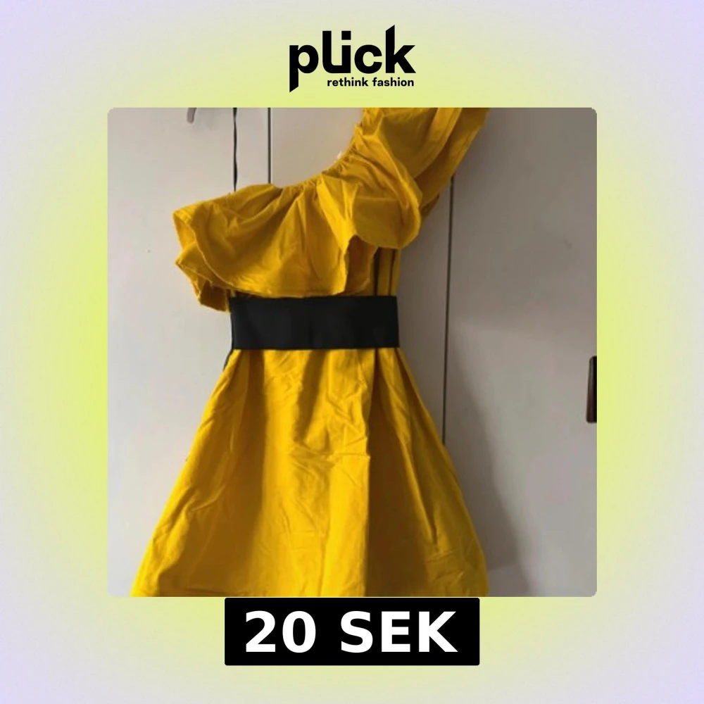 Säljer en statement gul klänning från Lanvin x H&M-kollektionen. Klänningen har en bred svart midjedetalj, volang upptill och en axel. Dragkedja i sidan. Perfekt för dig som vill sticka ut!