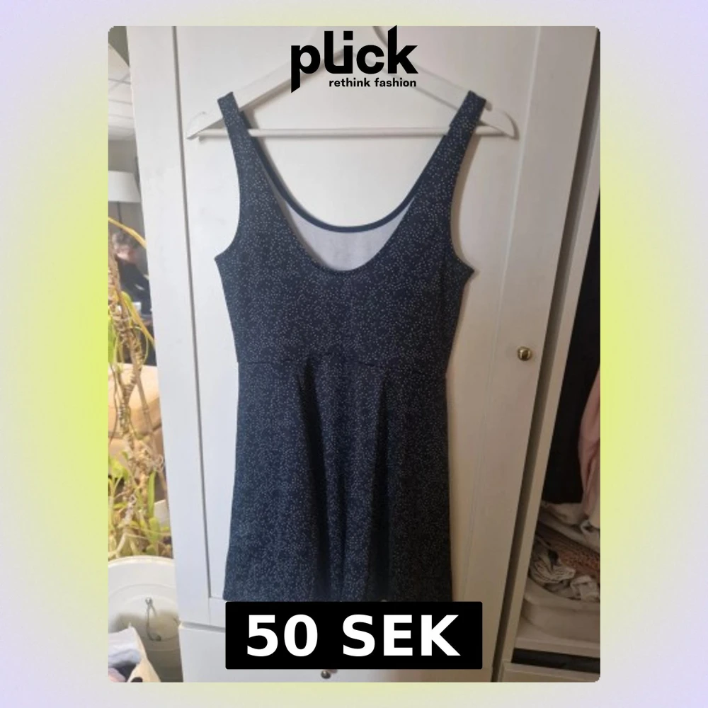 Söt mörkblå kortklänning från Divided by H&M med vitt prickigt mönster. Klänningen är ärmlös med rundad urringning och har en lätt utställd kjol. Perfekt för dig som gillar enkel men stilren design.