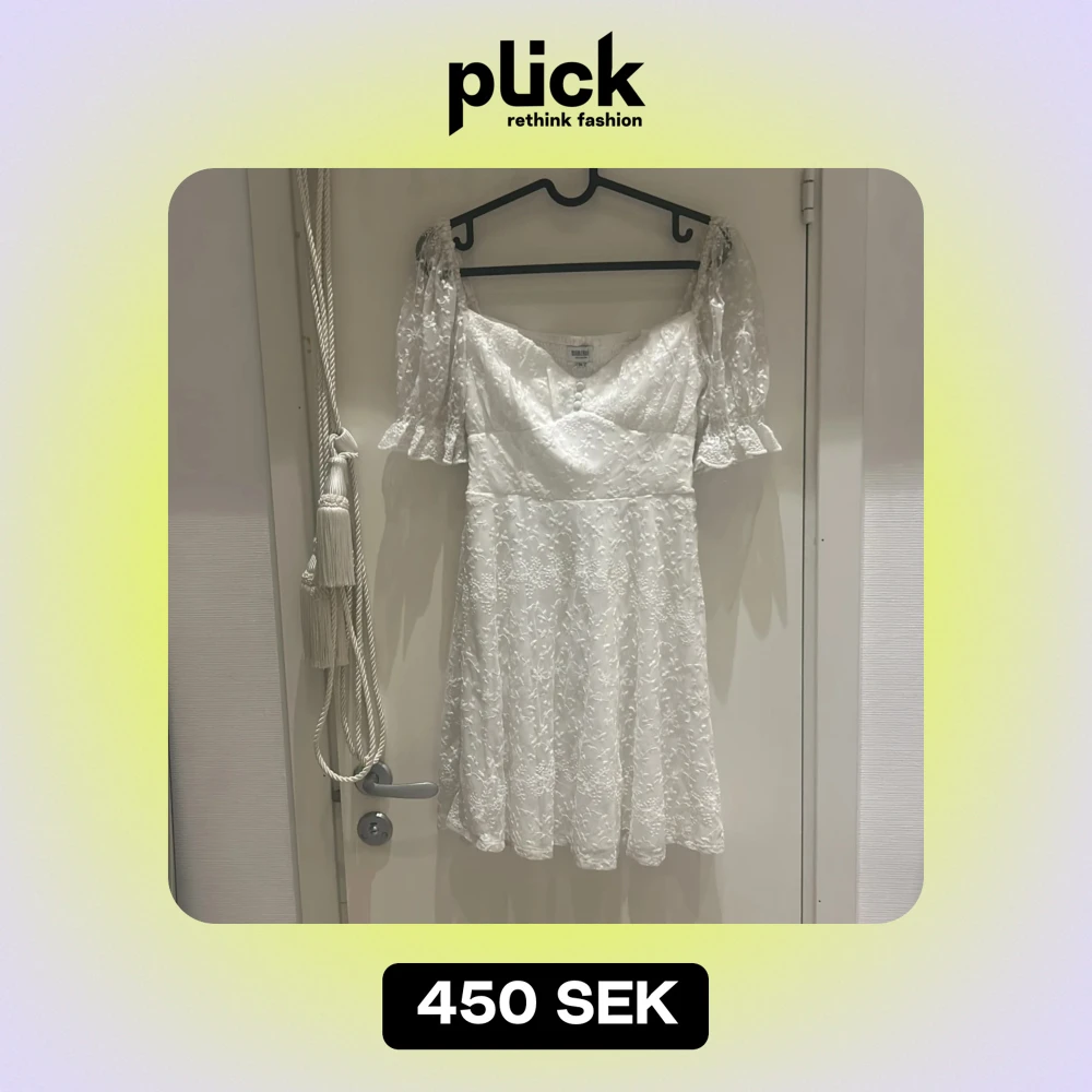 Säljer en superfin vit klänning i spets med puffiga kortärmar och en söt v-ringning. Perfekt för sommarens fester eller midsommarfirandet! Klänningen har en smickrande passform och är i mycket bra skick. Den är både romantisk och stilren, vilket gör den till ett måste i garderoben.