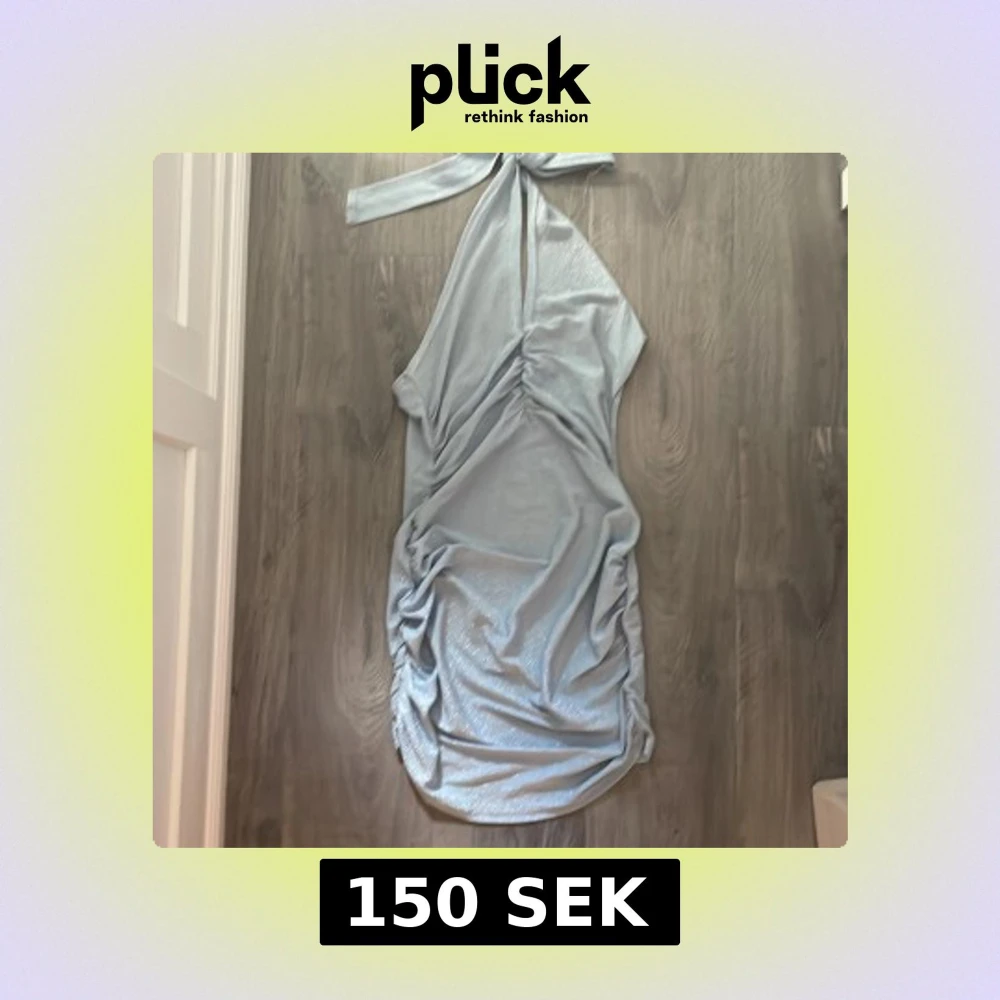 Snygg ljusblå glittrig klänning med oneshoulder-design och knytning i halsen. Perfekt för en festlig kväll!