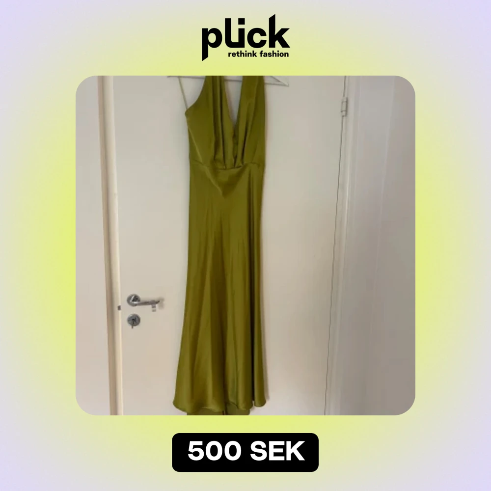 Olivgrön/rostgul satinklänningmed halterneck. Knappar i nacken och vadlång