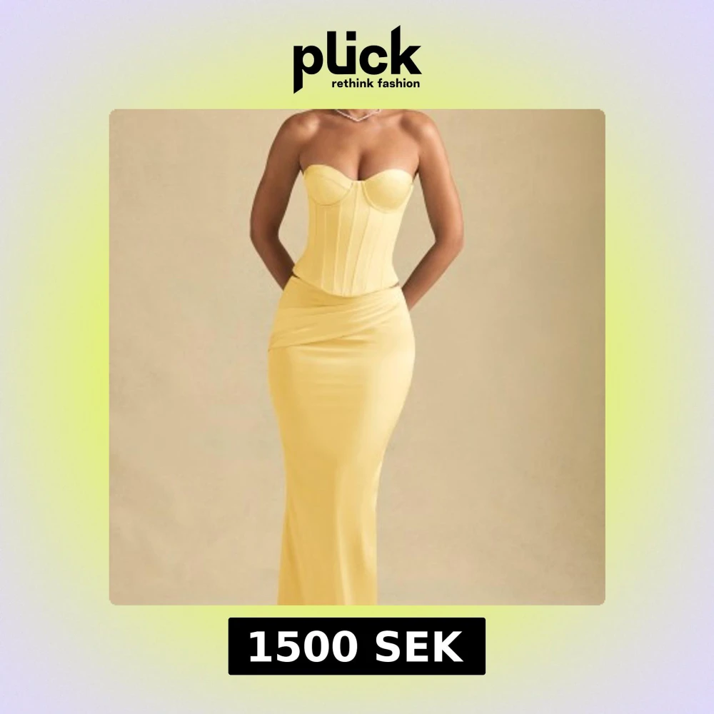 Supersnygg gul långklänning med figurnära passform och axelbandslös korsettliv. Klänningen har snörning i ryggen och en slät, glansig yta som ger en lyxig känsla. Perfekt för dig som vill sticka ut med en elegant och modern look.