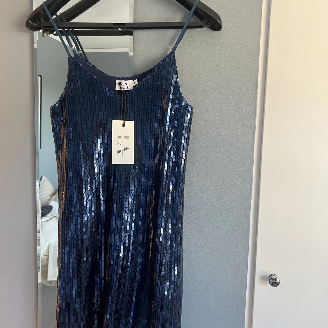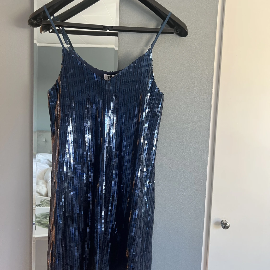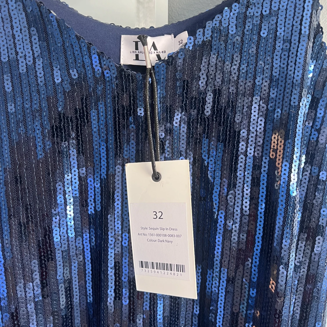 Säljer en blå glittrig klänning från Linn Ahlborg x NA-KD i storlek 32, stor i storleken. Aldrig använd med lapp kvar. Köpt för kanske 2 år sedan.