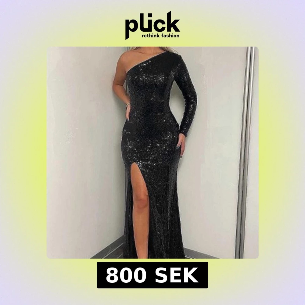 Snygg svart långklänning med glittrande paljetter och lång ärm. Klänningen har en hög slits framtill som ger en elegant och festlig look. Perfekt för speciella tillfällen när du vill sticka ut.