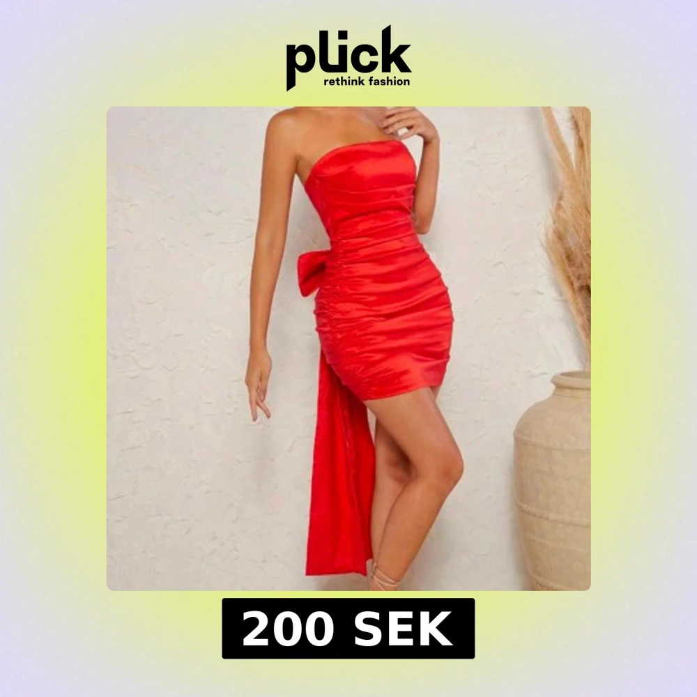Säljer en röd axelbandslös kortklänning med figurnära passform och stor rosett bak. Klänningen har draperade detaljer och en lång släp från rosetten. Perfekt för festliga tillfällen!