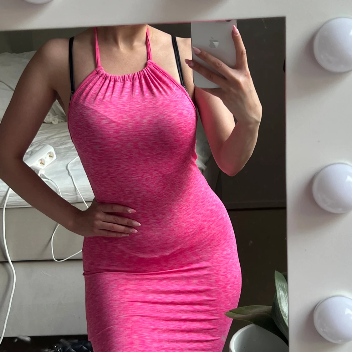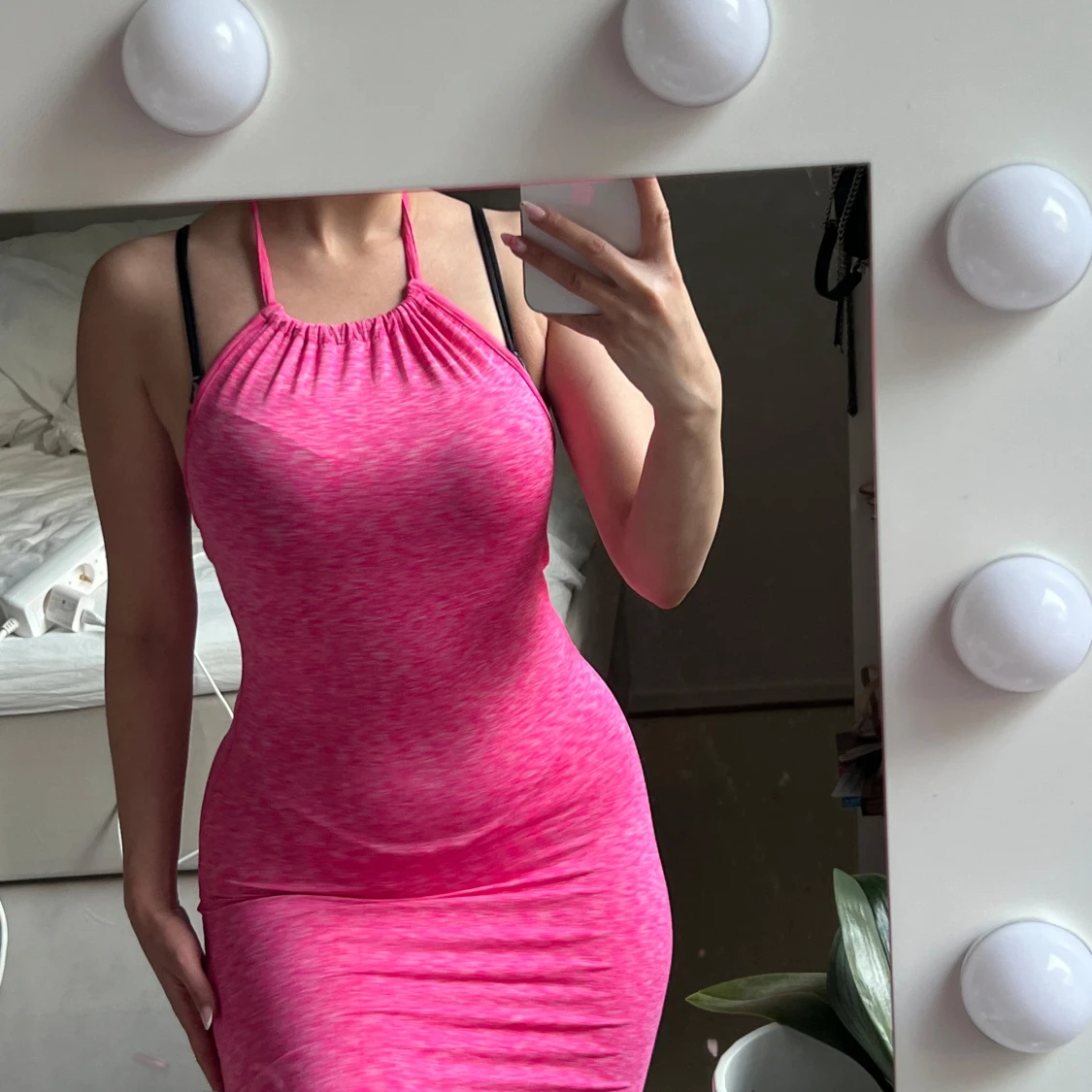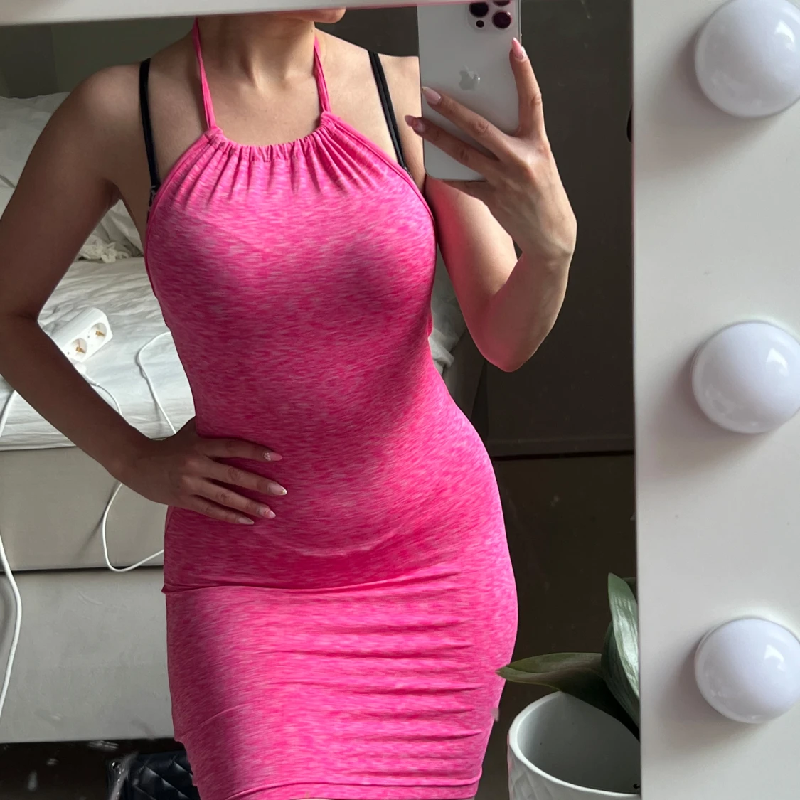 Supersnygg rosa kortklänning med halterneck och åtsittande passform. Klänningen har ett melerat mönster i olika rosa nyanser och tunna axelband. Perfekt för dig som vill sticka ut och känna dig extra cool.