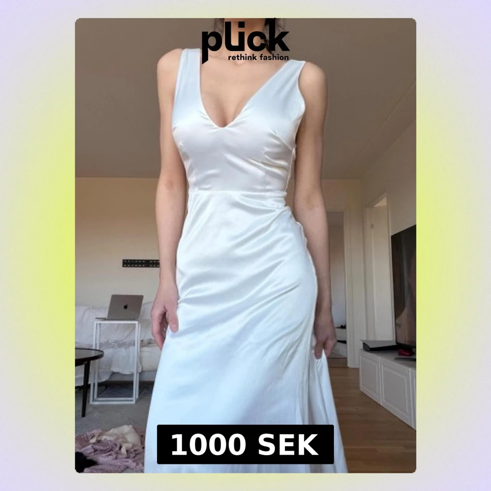 Elegant vit långklänning med v-ringning och breda axelband. Klänningen har en figurnära passform upptill och faller mjukt längs kroppen. Materialet har en satinliknande glans som ger en lyxig känsla. Perfekt för speciella tillfällen.