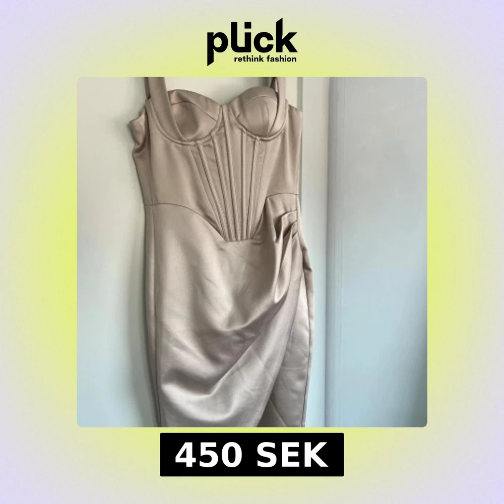 Supersnygg kort klänning i champagnefärgat satinliknande material med markerad bustier, draperad detalj vid höften och breda axelband. Figurnära passform och coola sömmar framtill ger en lyxig och trendig vibe.