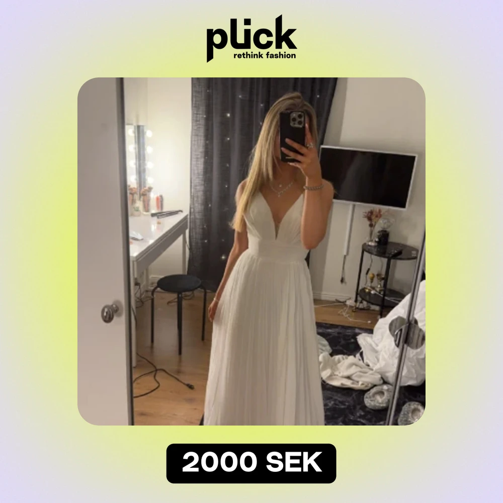 Vit balklänning från Pure White by lily - en brud och balklännings butik i Stockholm. Skydd runt klänningen tillkommer. Klänningen är uppsydd hos skräddare nertill samt banden runt axlarna. Precis vid kanten av brösttyget finns spår av smink (tvätt).