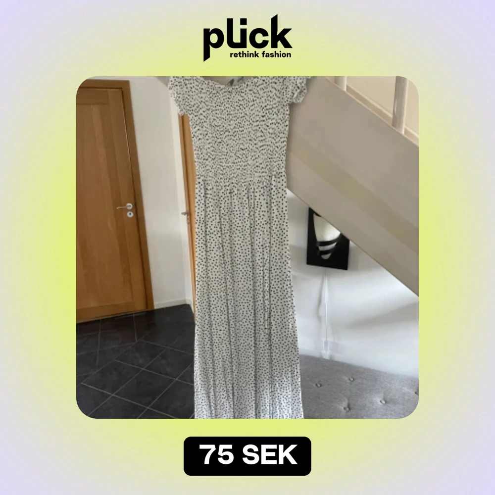 En jättefin vit klänning med svarta prickar som jag älskar men nu tyvärr växt ur. Inga hål eller liknande. Använd ca 5-10 gånger på fester och så. Skulle jättegärna haft kvar den om den passade mig. Köpt för 200kr säljer nu för 75kr. Matrial jag