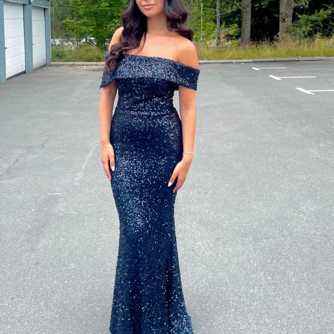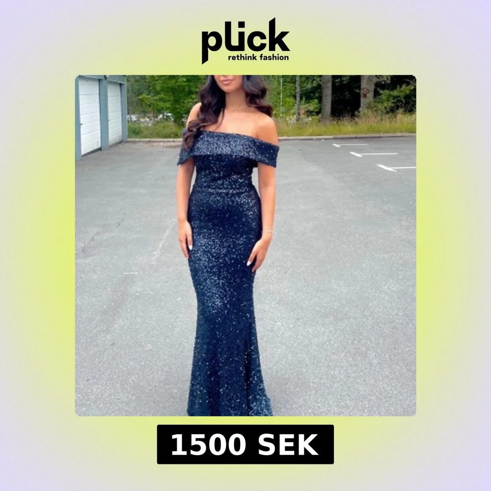 Supersnygg marinblå långklänning med glittriga paljetter över hela klänningen. Offshoulder-modell som framhäver axlarna och en figurnära passform som ger en elegant siluett. Perfekt för bal eller festkvällar när du vill sticka ut.