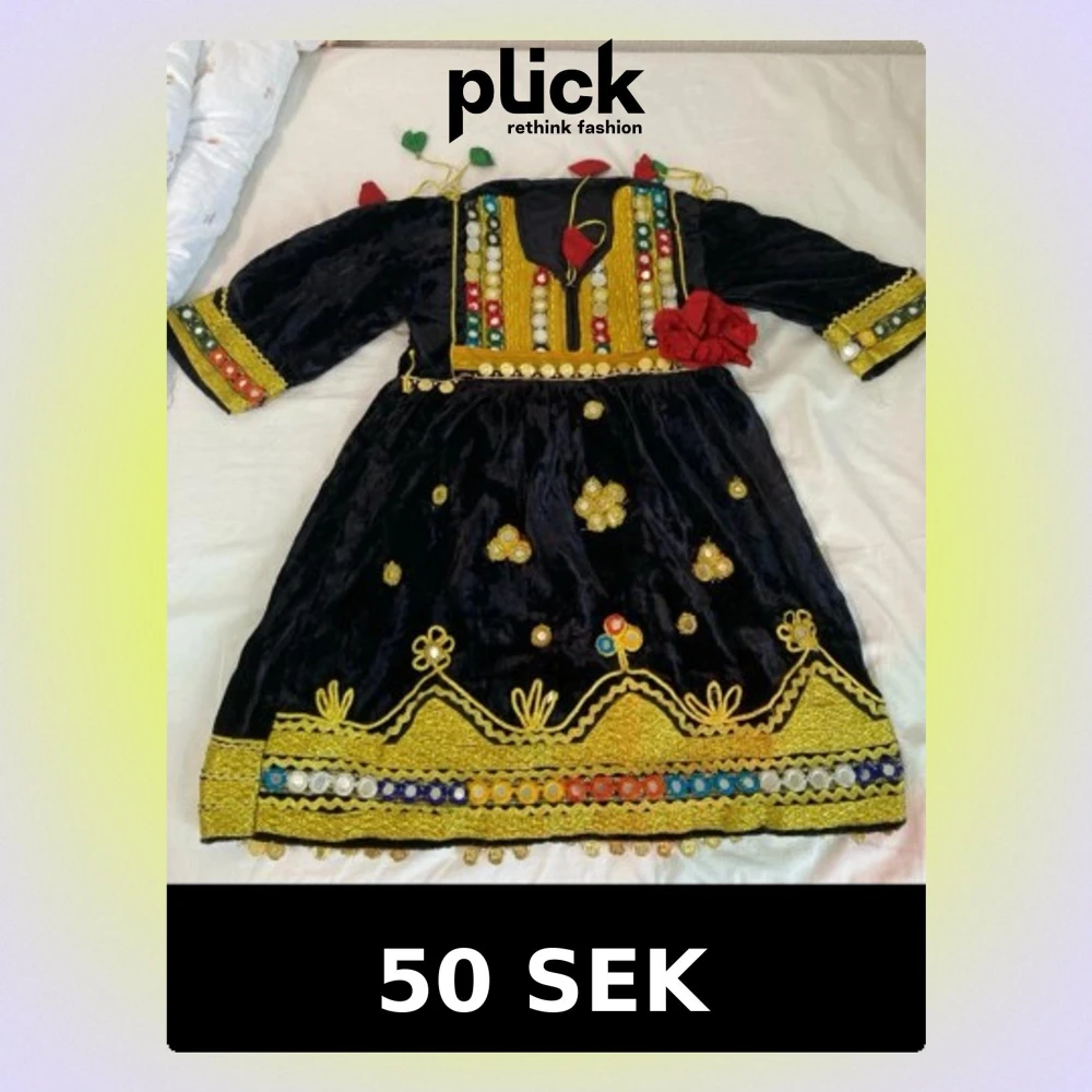 Unik svart klänning med färgglada broderier och spegeldekorationer i gult, rött, blått och grönt. Klänningen har trekvartsärm, v-ringning och detaljer som blommor, paljetter och en stor röd tygblomma på bröstet. Perfekt för dig som vill sticka ut med traditionell stil. Storlek 5-6 år. Arabisk klänning