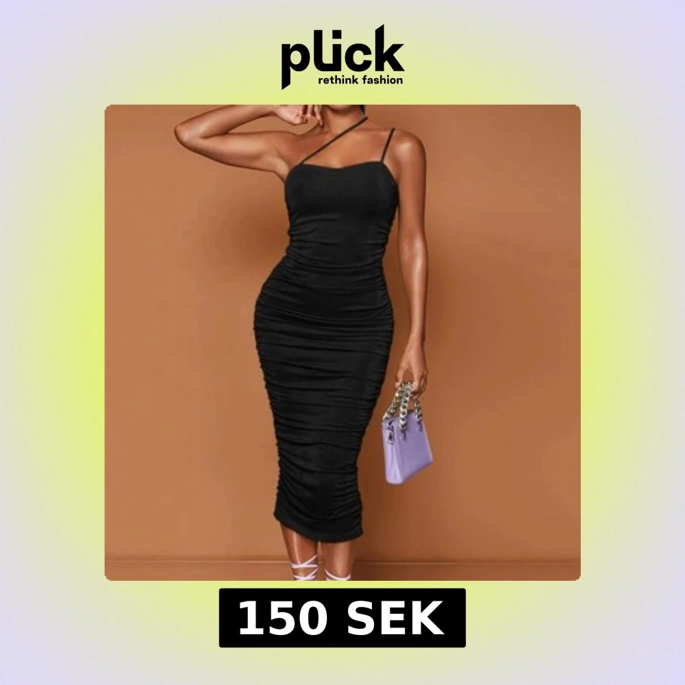 Snygg svart oneshoulder klänning med tight passform. Perfekt för en kväll ute. Den har en elegant design med en smal axelrem och rynkade detaljer längs sidorna. Nyttskick storlek Xs