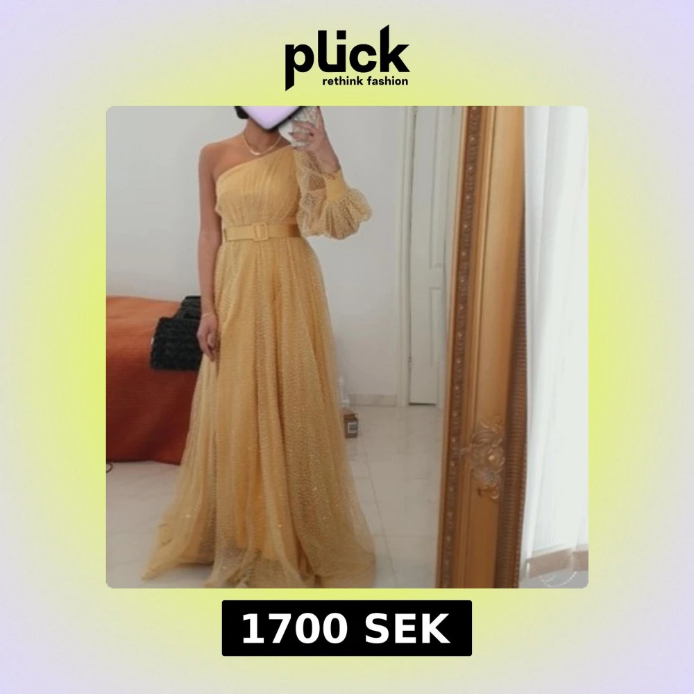 Säljer en maxad gul långklänning med glittrigt prickigt tyg, bred bälte i midjan och en dramatisk oneshoulder-ärm med volym. Klänningen har en snygg slits framtill och markerad midja. Perfekt för dig som vill sticka ut med en glamorös look. Från Mr.& Mrs.