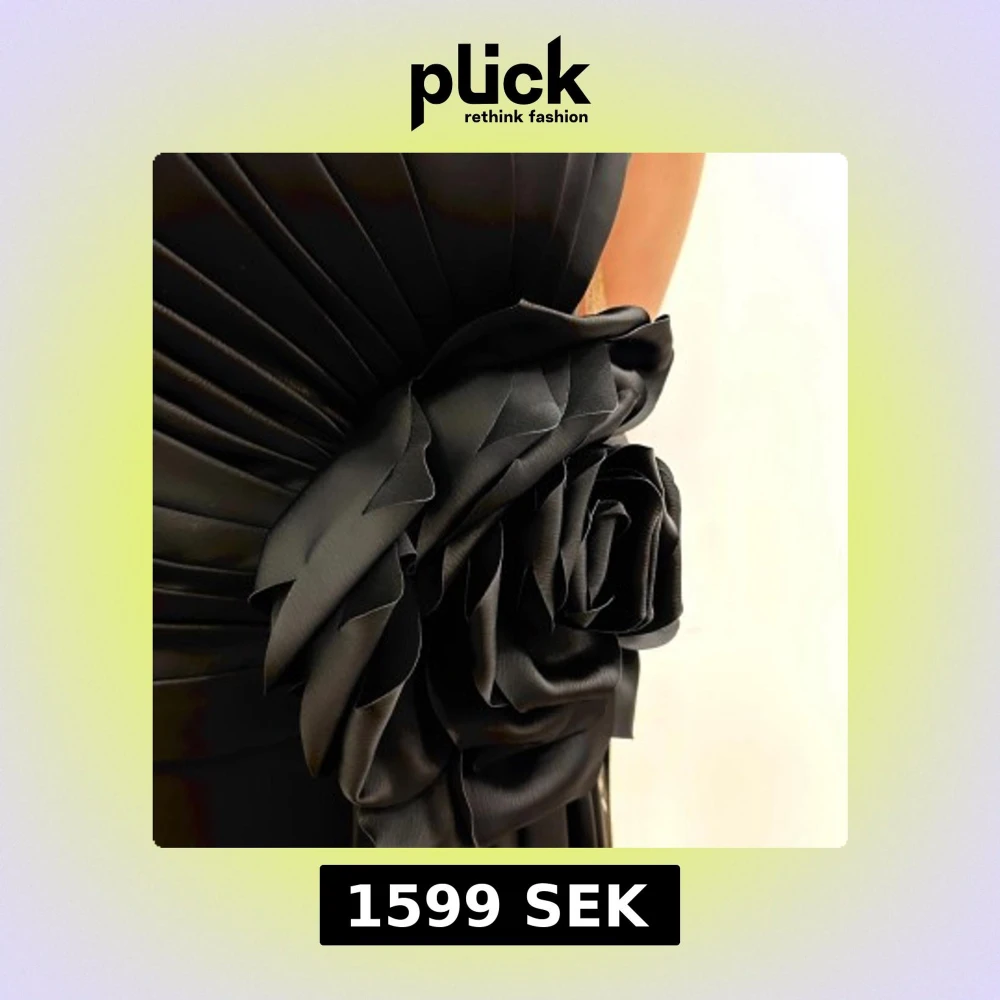 Superelegant svart långklänning från Mavina med en stor, dramatisk blomdetalj i midjan och snygga draperingar. Klänningen har en hög slits på sidan och är tillverkad i ett glansigt, följsamt material som ger en lyxig känsla.