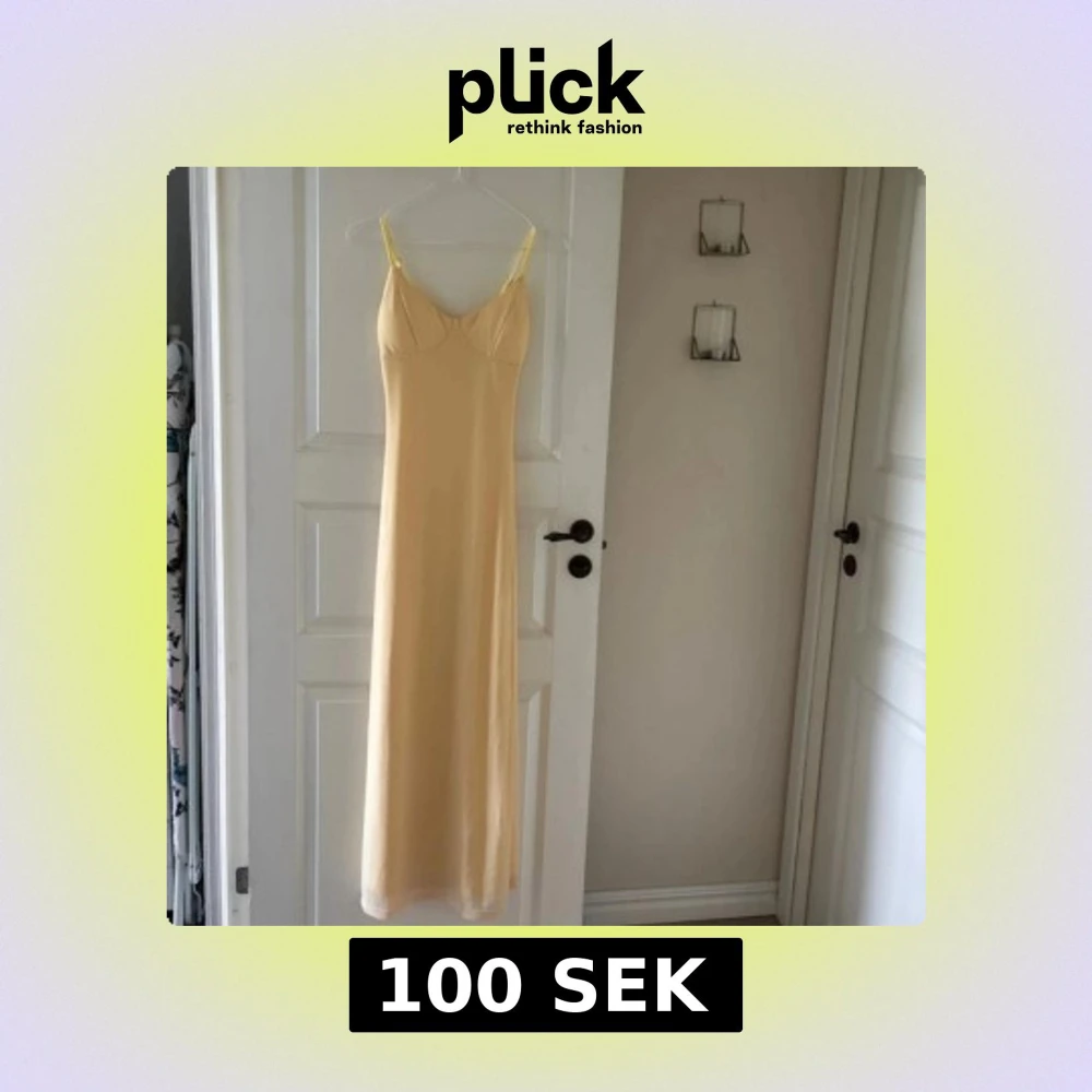 Supersöt långklänning i ljusgul nyans med smala justerbara axelband. Klänningen har en figurnära passform upptill och faller rakt ner. Perfekt för varma dagar och ger en fräsch och somrig vibe. Aldrig använd