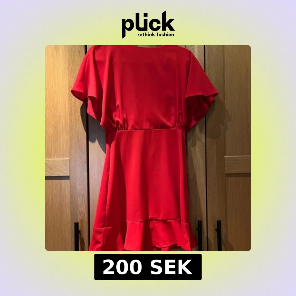 Säljer en röd klänning med korta vida ärmar och volangdetalj nertill. Klänningen har en markerad midja och är tillverkad i ett slätt, lätt material. Perfekt för dig som vill sticka ut med färg!
