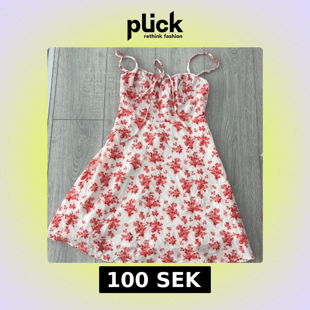 Charmig vit klänning med röda blommor och smala axelband. Den har en söt knytning framtill och är perfekt för varma dagar. Klänningen är kort och har en lätt och luftig känsla.