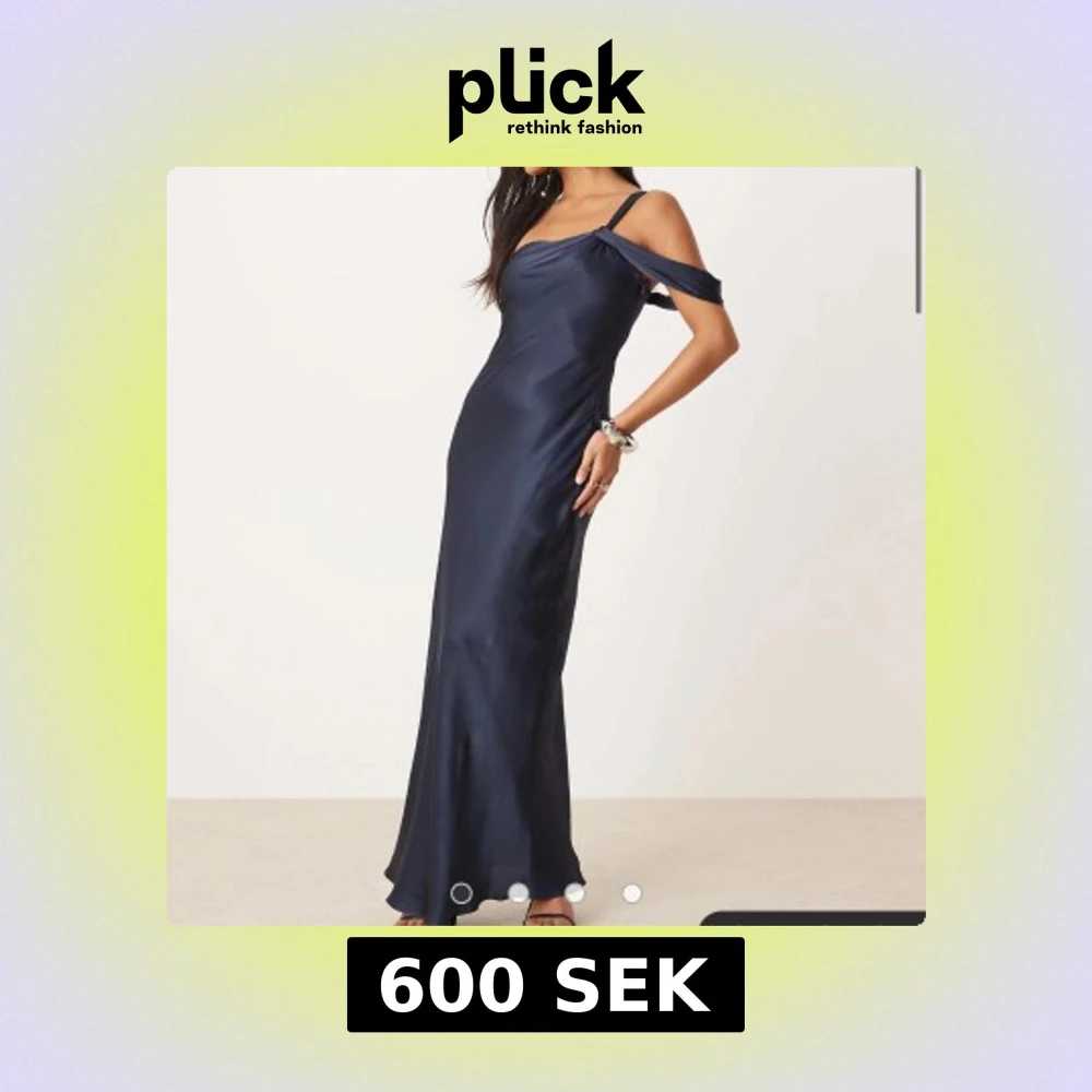 Snygg marinblå långklänning i satin med offshoulder och smala axelband. Klänningen har en elegant, figurnära passform och ett stilrent, slätt tyg som ger en lyxig känsla. Perfekt för speciella tillfällen.