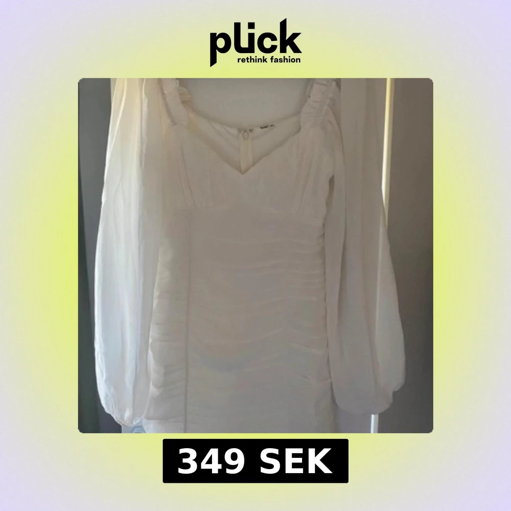 Supersöt vit kortklänning med långa, transparenta volangärmar och rynkade detaljer framtill. Klänningen har v-ringning och dragkedja i ryggen.