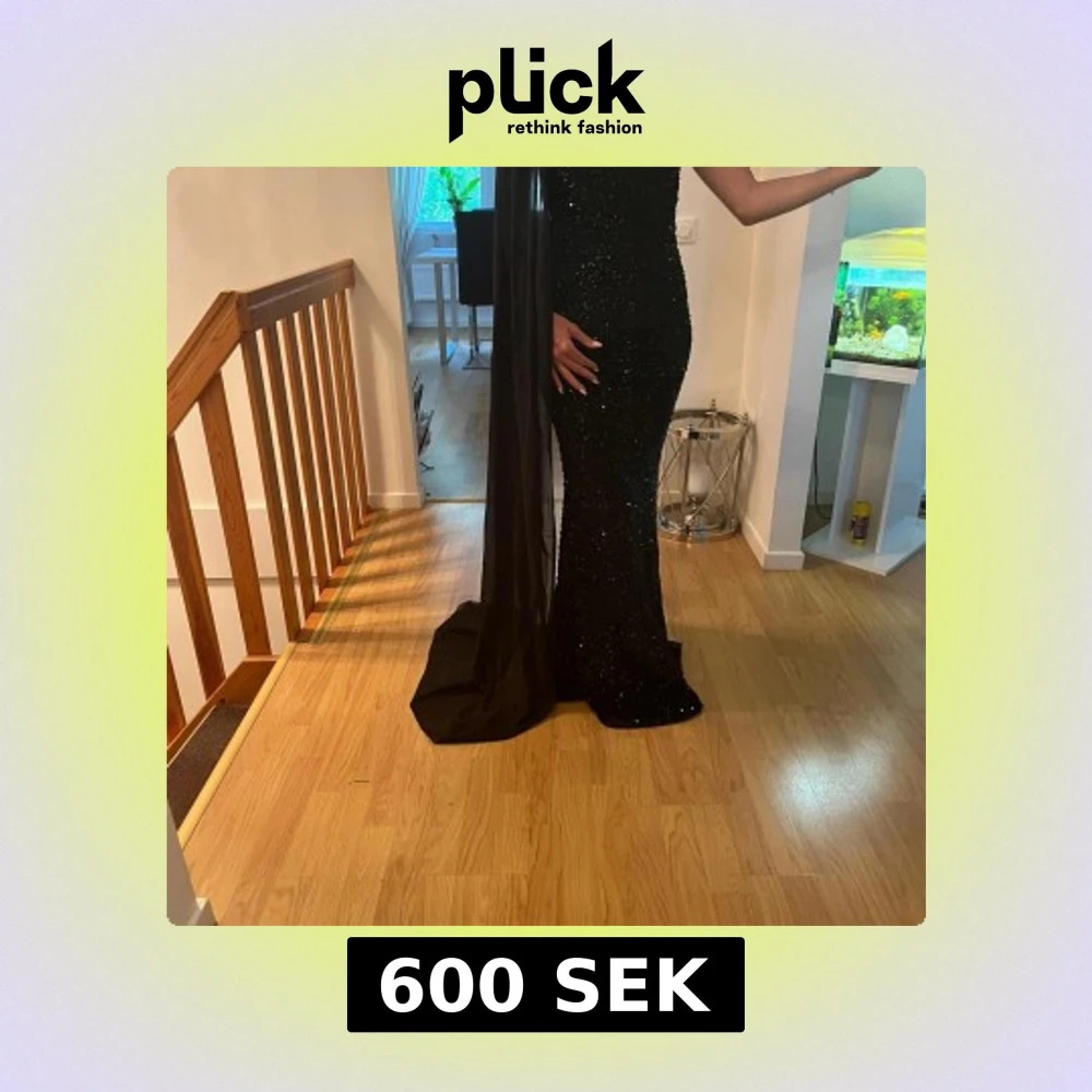 Supersnygg svart långklänning med glittriga paljetter och oneshoulder-design. Klänningen har en lång, elegant släp på ena axeln och sitter tight för en riktigt snygg siluett. Perfekt för dig som vill sticka ut och glänsa på bal eller fest.