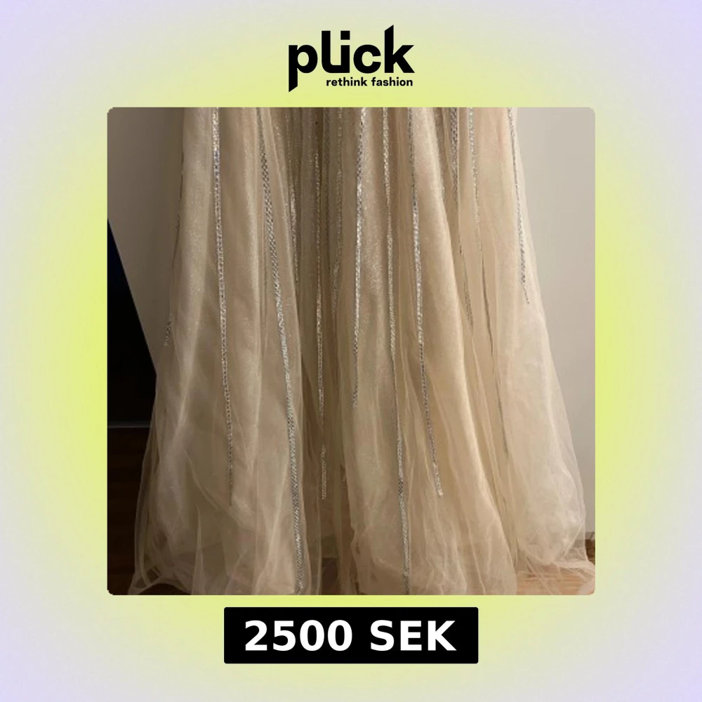 En magisk champagnefärgad långklänning med tunna axelband och djup v-ringning. Klänningen har glittriga silverränder som ger en lyxig känsla och ett skirt, svepande tyg som faller snyggt. Perfekt för bal eller nyår, du kommer definitivt sticka ut i denna drömklänning!