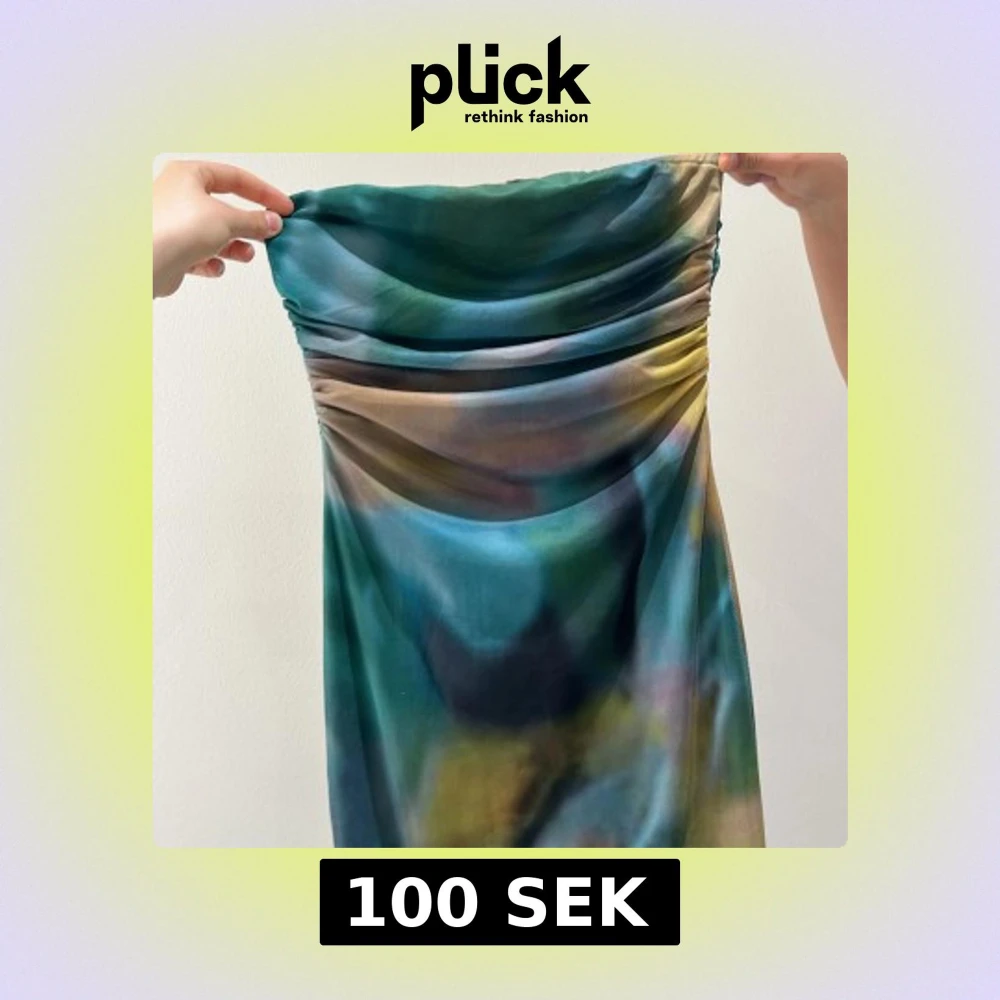 Säljer en snygg axelbandslös långklänning i gröna och blå toner med draperad överdel. Klänningen har ett mjukt, skimrande material och ett unikt mönster som ger en cool look. Perfekt för dig som vill sticka ut!